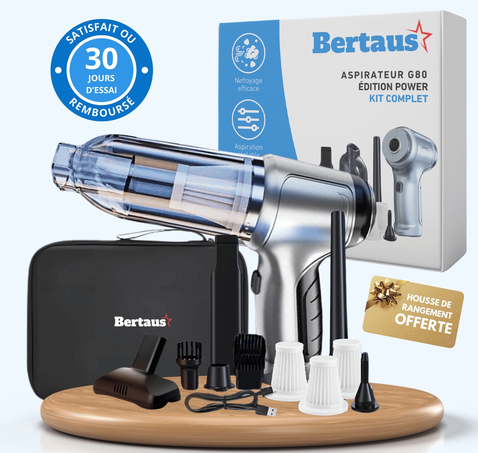 Le kit comprend : 1 Aspirateur G80, 1 câble de chargement USB, 1 embout d'aspiration plat + brosse, 1 buse d'aspiration brosse grande surface, 1 buse d'aspiration, 1 buse de soufflage ronde + brosse, 1 buse de soufflage de pompe à air, 1 housse de rangement offerte.