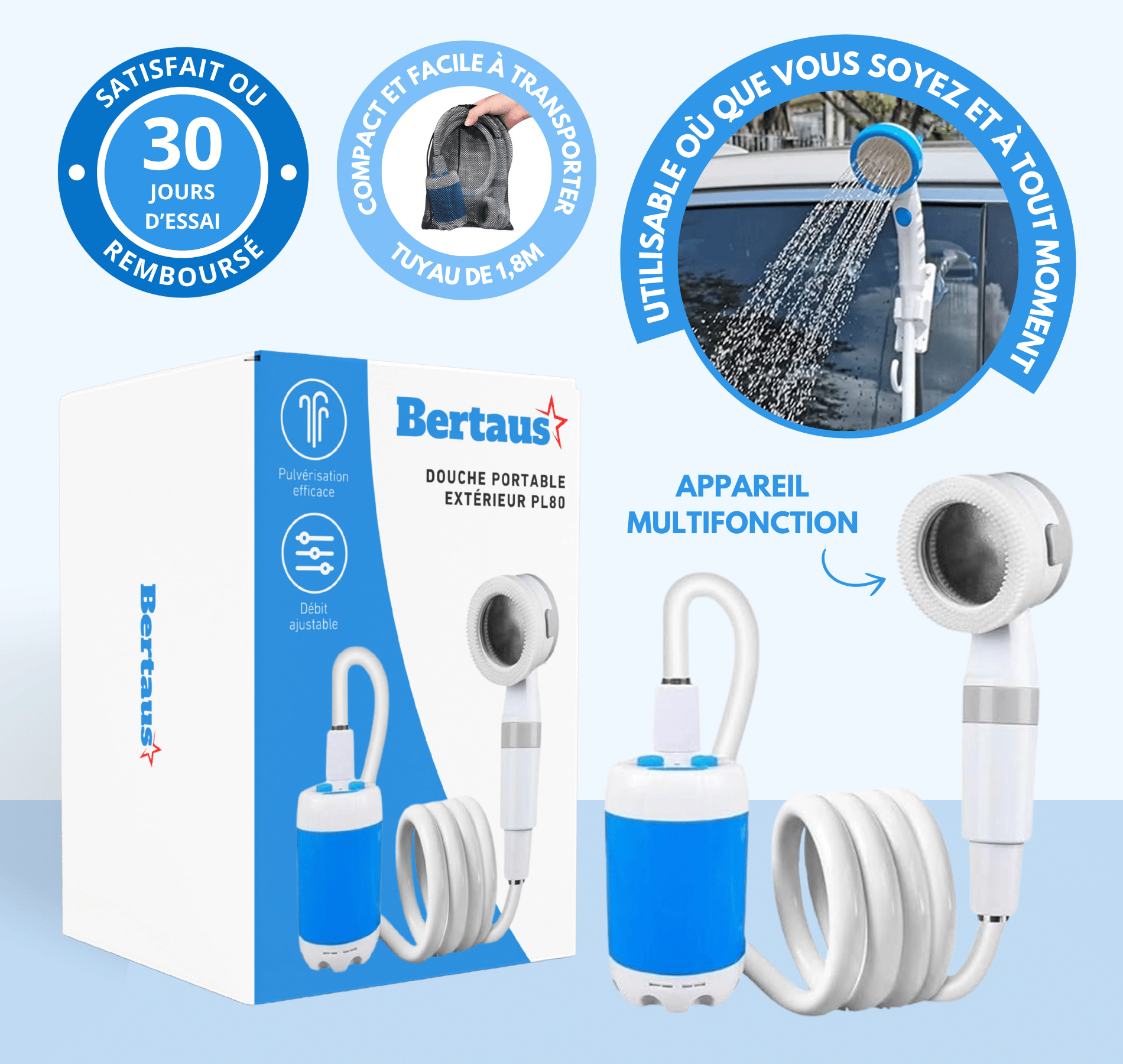 Emmenez votre confort sous la douche où que vous soyez : jardin, van, bateau ou chantier. Sans prise, sans tuyau contraignant et sans effort, notre douche portable électrique vous offre une pression inégalée et une autonomie longue durée.