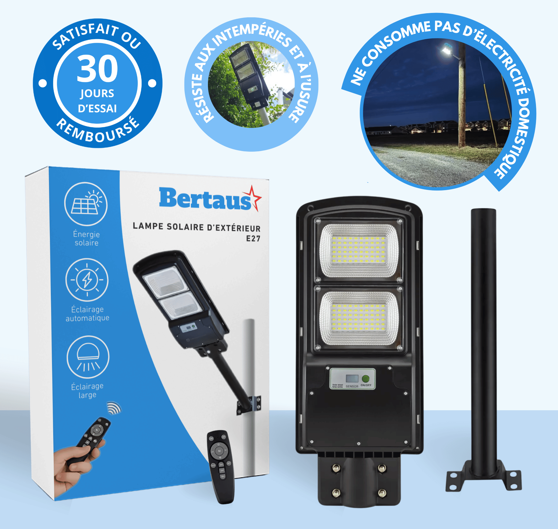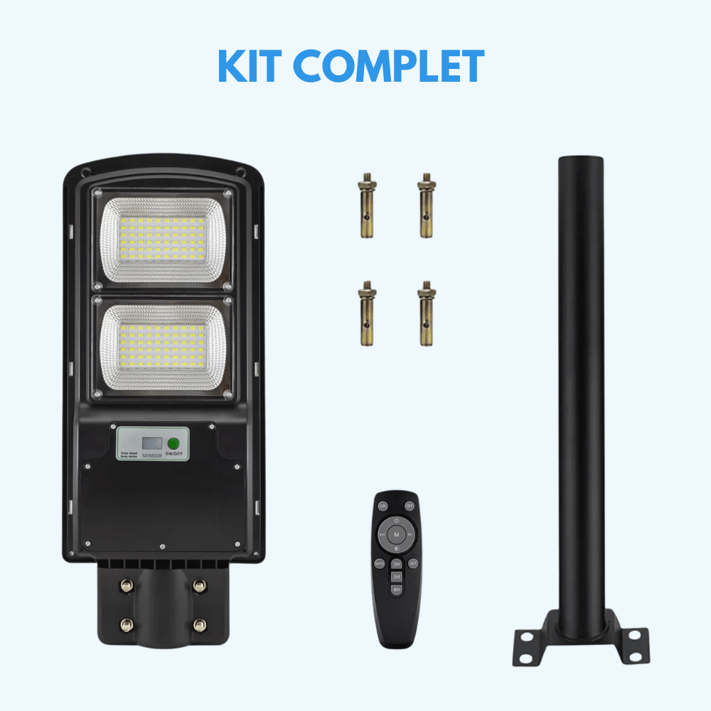 Cette lampe solaire d'extérieur est capable d’illuminer jusqu’à 6 000 Lumens, éclairant parfaitement l’endroit de votre choix. Contrairement aux autres lampes extérieures fragiles, notre lampadaire est conçu pour durer et offre un éclairage optimal même dans les conditions les plus difficiles.