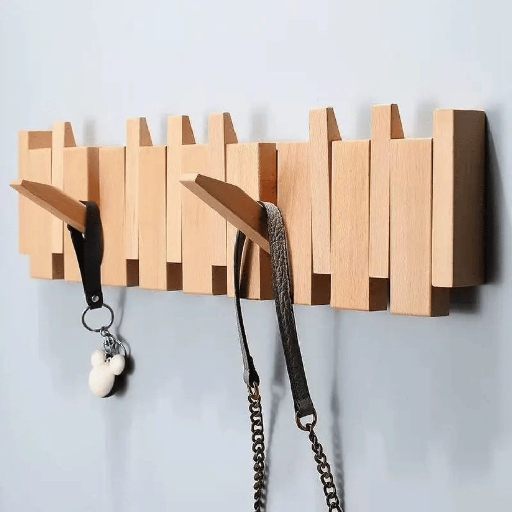 Les crochets rabattables se fondent parfaitement dans le bois lorsqu’ils ne sont pas utilisés. En un clic, ils se déplient pour accueillir manteaux, sacs ou serviettes, puis disparaissent aussitôt pour un look propre et minimaliste. Gagnez de la place sans sacrifier le style.